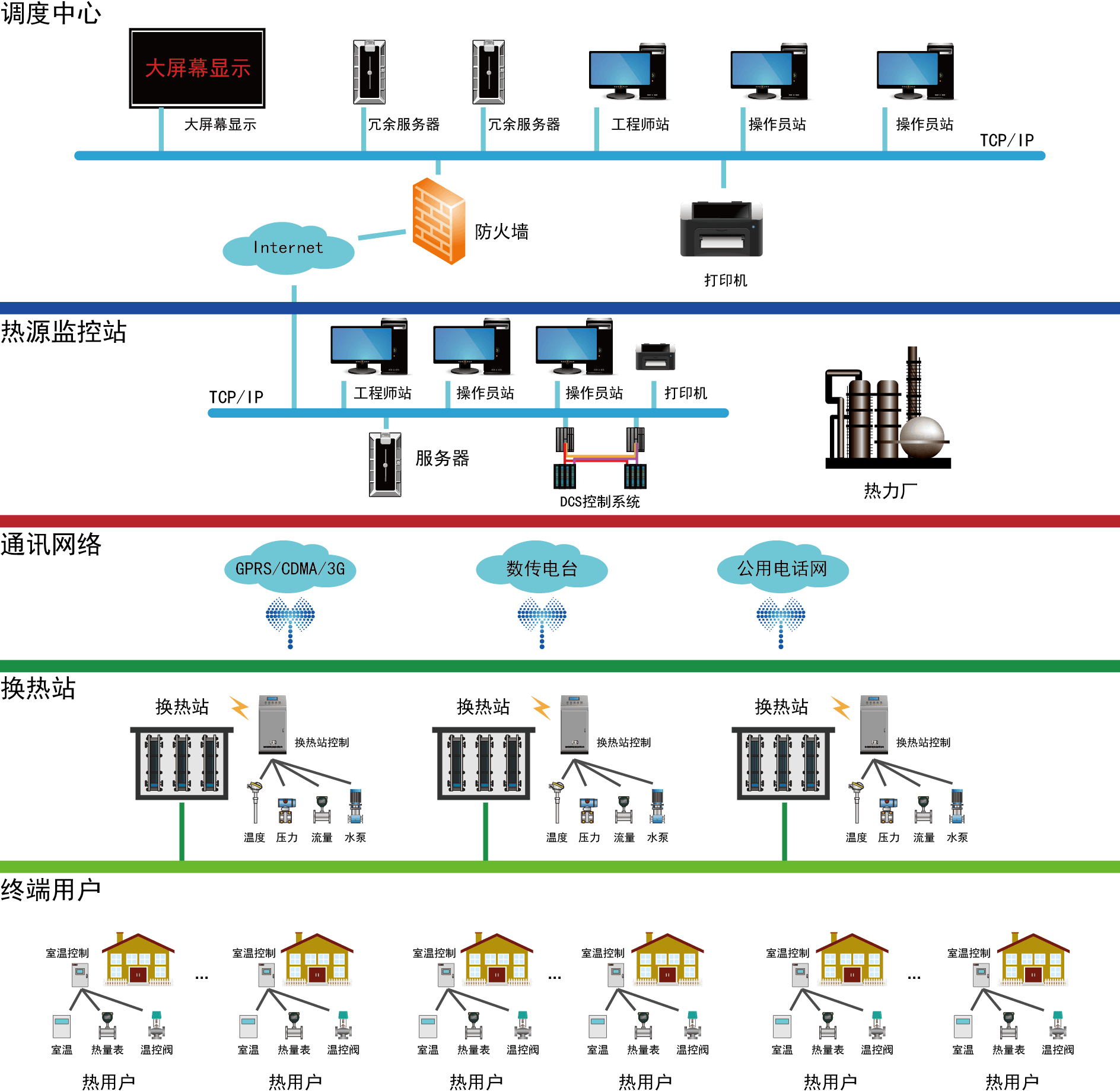 The city central heating system includes heat plant, heat exchanger, heat pipe and heat users four links. The heat source plant is the heat circulation system of heat generated links, the heat exchange station is thermal energy conversion process, the heat pipe heat transport links, the user is energy use of links.